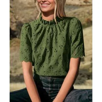 Show more Introducing the perfect summer wardrobe staple for women: our Eyelet Tops. These trendy and stylish tops are expertly crafted with soft and lightweight materials that ensure ultimate comfort during warm weather. Designed for versatility, these blouses easily transition from casual afternoons to dressy evenings. Featuring short sleeves and a unique ruffle neck design, they offer a touch of femininity that appeals to modern women. The hollow-out feature adds a fashionable twist while keeping you cool and stylish all summer long.