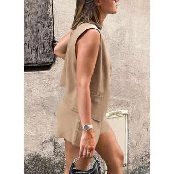 PRETTYGARDEN Two Piece Outfits for Women Summer Button Up V Neck Vest Waistcoat and Pockets Shorts Chic Casual Matching Sets (Khaki,Large)