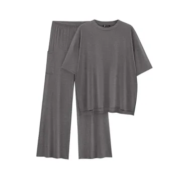 Featuring a stylish design, this ensemble includes a chic short sleeve pullover with a trendy crewneck and split hem, paired with wide leg pants that offer ample leg room and a relaxed fit. The thoughtful addition of two side pockets provides extra storage space for your essentials, ensuring functionality without compromising on style. Available in a striking dark grey, this set showcases versatility and elegance, enabling you to mix and match with other wardrobe staples.