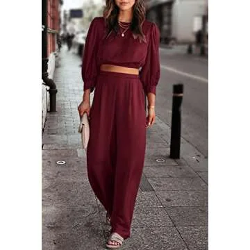 PRETTYGARDEN Women's 2 Piece Satin Outfits 2024 Spring Casual Puff Sleeve Crop Tops Blouse And Long Palazzo Pants Set (Wine Red,Small)