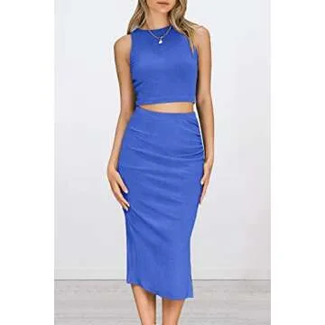 PRETTYGARDEN Women's 2 Piece Summer Outfits Crewneck Tank Tops Split Bodycon Midi Skirt Set (Blue,Large)