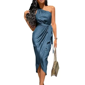Show moreThe PRETTYGARDEN Women's 2024 Summer Ruched Bodycon Dress is an absolute must-have for fashion enthusiasts this season! Featuring a stunning sleeveless one-shoulder design and crafted from a soft, lightweight satin fabric, this beautiful midi dress feels as luxurious as it looks. Imagine stepping into a summer gathering, the sun setting, and you radiating confidence in this eye-catching dress with a chic asymmetrical hem. With its exquisite silhouette and vibrant colors like dark blue, deep red, and army green, you are sure to turn heads at any event.