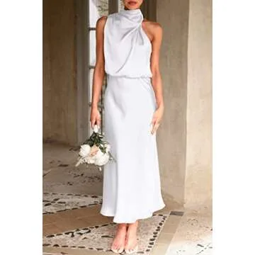 PRETTYGARDEN Women's 2025 Summer Satin Dress Elegant Sleeveless Mock Neck Cocktail Party Maxi Dresses (White,Medium)