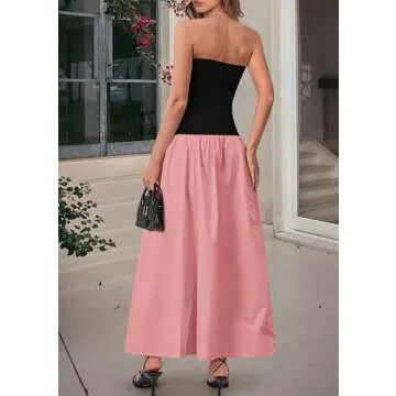 such as a slim fit bodice, elastic waistband, and a flowy hemline,