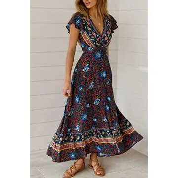 PRETTYGARDEN Women's Casual Long Summer Dresses Boho Floral Wrap V Neck Short Sleeve Split Maxi Beach Dress (Navy,Large)