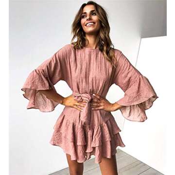 PRETTYGARDEN Women’s Casual Solid Color O-Neck 3/4 Bell Sleeve Ruffle Swing A Line Mini Dress Sundress with Belt (Pink, Medium)