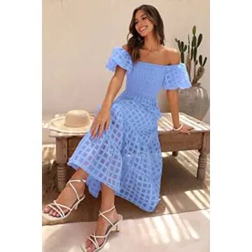 PRETTYGARDEN Women's Casual Summer Dress Puffy Short Sleeve Square Neck Smocked Tiered A Line Maxi Long Dresses (Plaid Sky Blue,X-Large)