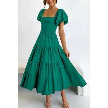 PRETTYGARDEN Women's Casual Summer Midi Dress Puffy Short Sleeve Square Neck Smocked Tiered Ruffle Dresses (Dark Green,Medium)