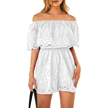 Show moreIntroducing the PRETTYGARDEN Women's Embroidery Rompers Dressy 2024 Summer Casual Off Shoulder Ruffle Shorts Jumpsuits, your ultimate go-to outfit for summer fun! This romper combines playful elegance with trendy design, making it the perfect choice for vacations, picnics, and summer parties. Crafted with lightweight eyelet fabric and beautiful embroidered details, it promises comfort and style in one delightful package. The off-shoulder ruffle design adds a touch of femininity, allowing you to feel chic while enjoying the summer breeze. Available in a beautiful white that highlights the intricate embroidery, it’s designed to flatter all body types and make you feel fabulous.