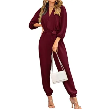 PRETTYGARDEN Women's Fall Jumpsuits Casual Dressy One Piece Outfits V Neck Long Sleeve Belt Pockets Long Pants Romper (Wine Red,XX-Large)