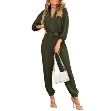 PRETTYGARDEN Women's Fall Jumpsuits Casual Dressy One Piece Outfits V Neck Long Sleeve Belt Pockets Long Pants Romper