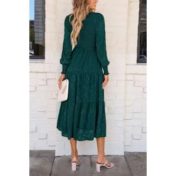 PRETTYGARDEN Women's Fall Spring Midi Dress Long Sleeve Floral Smocked Elegant Wedding Guest Long Flowy Dresses with Pockets (Malachite Green,X-Large)