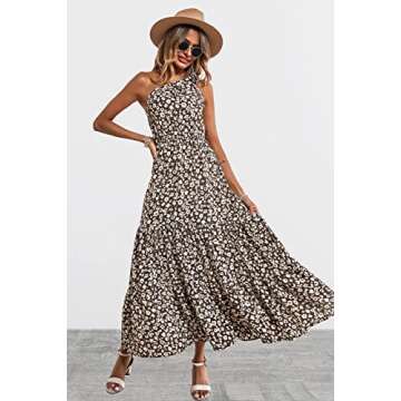 PRETTYGARDEN Women's Floral Maxi Dress 2024 Knot One Shoulder Sleeveless Ruffle Hem Flowy Boho Dresses(Coffee,Medium)