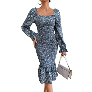 Featuring long lantern sleeves and a stylish square neckline, the elegant mermaid silhouette is adorned with a charming floral print that accentuates your femininity. The ruffle hem adds a playful touch, making it an enchanting choice for cocktail parties, weddings, or date nights. Whether you style it with heels for an upscale look or sandals for something more relaxed, this versatile dress is sure to make a statement.