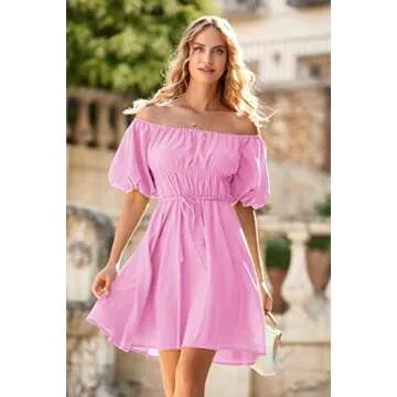 PRETTYGARDEN Women's Off The Shoulder Babydoll Dress Short Puff Sleeve Casual A Line Ruffle Summer Dresses (Solid Pink,Medium)
