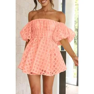 PRETTYGARDEN Women's Off The Shoulder Babydoll Dress Short Puff Sleeve Casual A Line Ruffle Summer Dresses (Plaid Peach Pink,Small)