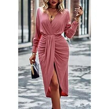 Show more Step out in style with the PRETTYGARDEN Women's Ruched Wrap Dress, a stunning midi dress that combines elegance and ease. Crafted for the contemporary woman, this dress features a graceful draped front that flatters the figure while the ruched detailing adds just the right amount of texture. The long sleeves offer a modest touch, and the V neck enhances your neckline, making it perfect for both casual outings and special occasions. Available in a chic pink hue, this dress is designed to help you stand out effortlessly.