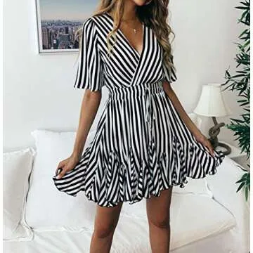 PRETTYGARDEN Women's Sexy Deep V Neck Short Sleeve Striped Wrap Ruffle Hem Pleated Mini Dress with Belt Black (Black, Medium)