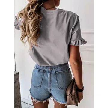 Show more Introducing the PRETTYGARDEN Women's Short Sleeve Casual T Shirts, your new go-to for stylish summer essentials! Crafted from a premium polyester blend fabric, this tee blouse offers exceptional softness and comfort while remaining lightweight and breathable. The unique design includes a basic round neck, short sleeves, and stylish ruffle details, combining a relaxed fit with a trendy twist. Perfect for any wardrobe, these t-shirts gracefully merge versatility and chic appeal, ensuring you'll look fabulous whether you're lounging at home or hitting the beach!