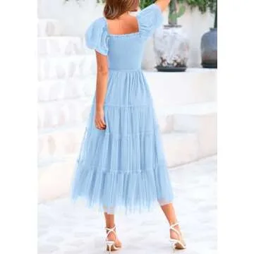 Show moreEmbrace the epitome of summer elegance with the PRETTYGARDEN Women's Smocked Midi Tulle Dress. This exquisite light blue dress, crafted from lightweight and airy tulle fabric, provides a mesmerizing flow that dances with you during every step. Designed for ultimate comfort, it is the ideal choice for warm summer days. The dress features a flattering square neckline adorned with charming puffed sleeves, effortlessly blending chic sophistication with timeless femininity. The fitted bodice beautifully transitions into a tiered skirt, creating a dreamy silhouette that is both romantic and figure-flattering.