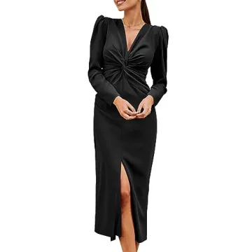 Designed with keen attention to detail, this Maxi Dress features long puffy sleeves that bring a touch of romance to your outfit, while the flattering V-neckline elongates your silhouette. The uniquely styled twist front adds a charming flair, and the tasteful slit enhances your movements, ensuring you can strut with confidence. This dress is versatile enough to transition seamlessly from day to night, allowing you to pair it with heels, ankle boots, or eye-catching accessories.