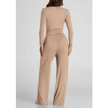 PRETTYGARDEN Women's Spring Fall Two Piece Outfits Tracksuits Long Sleeve Crop Tee Shirts Wide Leg Pants Matching Lounge Sets (Khaki,Medium)