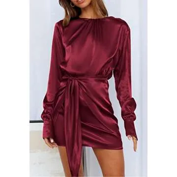 PRETTYGARDEN Women's Spring Satin Dress Long Sleeve Tie Waist Elegant Cocktail Party Mini Fall Dresses(Wine Red,Large)