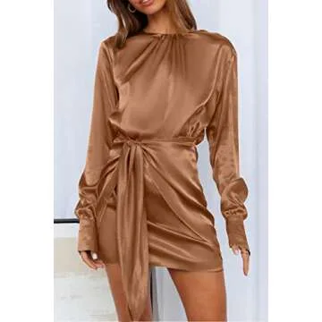 Show more Step into elegance with the PRETTYGARDEN Women’s Spring Satin Dress, a stunning long sleeve mini dress designed to turn heads and keep you comfortable all day long. Made from high-quality polyester, this dress features a sumptuous satin finish that is soft to the touch. It boasts a sophisticated ruched crewneck design and a keyhole button closure at the back, making it easy to wear yet stylish. The included tie waist allows you to cinch the waist and highlight your silhouette while providing a flattering fit that helps disguise any unwanted tummy areas. Perfect for various occasions, from cocktail parties to office gatherings, this dress is versatile and chic.