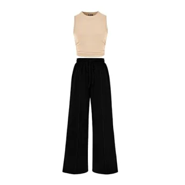 Each set includes a crop tank top that's designed with a waist side ruched detail to enhance your silhouette, paired with wide leg pants featuring a customizable drawstring elastic waist and convenient side pockets for practicality. With sizes ranging from S (US 4-6) to XXL (US 20), everyone can find their perfect fit.