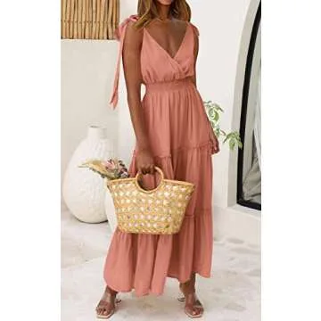 Show more Introducing the stunning Sleeveless Smocked Maxi Dress that epitomizes elegance and comfort. This versatile dress is crafted from flowing fabric that gracefully drapes over your silhouette, making it the ideal choice for any summer occasion. Designed with tie straps that can be adjusted for the perfect fit, this maxi dress features a chic cross neck wrap design that offers both style and sophistication. The ruffle details and smocked waist effortlessly enhance your femininity, giving you a flattering look whether you’re at a beach party, a wedding, or enjoying a casual day out.