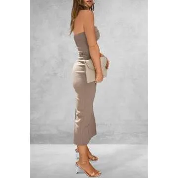 PRETTYGARDEN Women's Summer Bodycon Maxi Tube Dress Ribbed Strapless Side Slit Long Going Out Casual Elegant Party Dresses (Khaki,Medium)