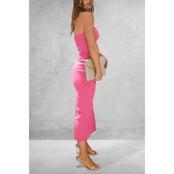 PRETTYGARDEN Women's Summer Bodycon Maxi Tube Dress Ribbed Strapless Side Slit Long Going Out Casual Elegant Party Dresses (Rose Pink,X-Small)