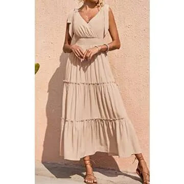 Show more Introducing the PRETTYGARDEN Women's Summer Boho Spaghetti Strap Sleeveless Tiered Maxi Dress, a stunning addition to your summer wardrobe that perfectly blends style, comfort, and versatility. This exquisite maxi dress features tie straps for a customizable fit, enhancing your silhouette while ensuring you stay cool during the warm months ahead. Crafted from soft and flowing fabric, its lightweight design drapes beautifully on the body, allowing for unrestricted movement no matter the occasion.