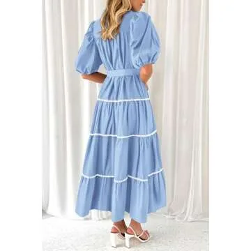 PRETTYGARDEN Women's Summer Button Down Shirt Dress Short Puffy Sleeve Tiered Ruffle Flowy Long Maxi Dresses (Light Blue,Medium)