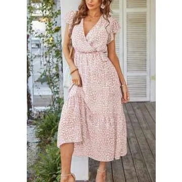PRETTYGARDEN Women's Summer Floral Boho Dress Wrap V Neck Short Sleeve Ruffle A-Line Flowy Maxi Wedding Guest Dresses (Pink,Small)