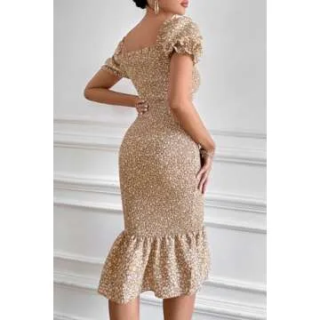 PRETTYGARDEN Women's Summer Floral Midi Bodycon Dresses Short Puff Sleeve Square Neck Ruffle Hem Mermaid Cocktail Dress (Khaki,Medium)