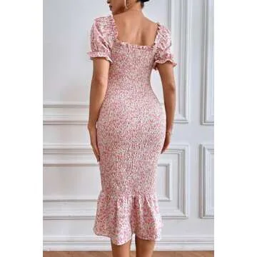 PRETTYGARDEN Women's Summer Floral Midi Bodycon Dresses Short Puff Sleeve Square Neck Ruffle Hem Mermaid Cocktail Dress (Pink,XX-Large)