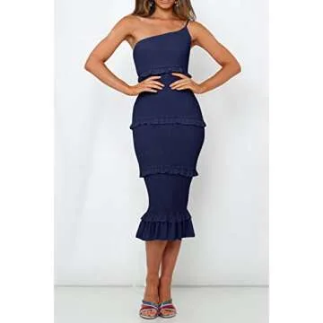 PRETTYGARDEN Women's Summer Midi Bodycon Dresses One Shoulder Strappy Tiered Ruffle Floral Boho Sun Dress (Solid Navy,Large)