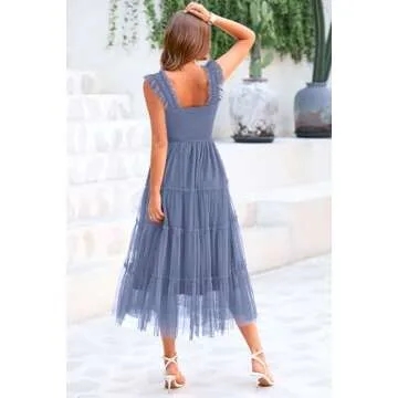 Show moreIntroducing the PRETTYGARDEN Women's Summer Midi Tulle Dress in a beautiful grey-blue, designed to be your go-to sundress for any occasion. Crafted from an airy and lightweight fabric, this midi dress promises an extremely comfortable wearing experience. Boasting a trendy sleeveless design with an elegant square neck, the smocked bodice accentuates your figure, creating a charming hourglass silhouette. The delicate tulle fabric adds a touch of elegance and femininity, making this piece not just a dress, but a statement of style and grace.