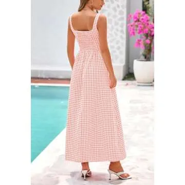 PRETTYGARDEN Women's Summer Spaghetti Strap Maxi Dresses Plaid Square Neck A Line Smocked Casual Vacation Long Sundress (Pink,Small)
