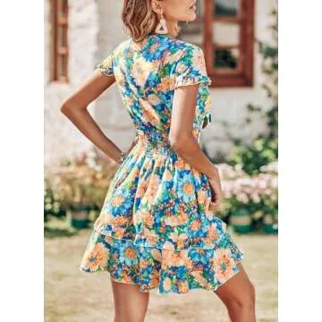 PRETTYGARDEN Women's Summer Swing Mini Dress Casual V Neck Short Sleeve Ruffle Tiered Layer A-Line Short Bow Dress (Floral Blue,Small)