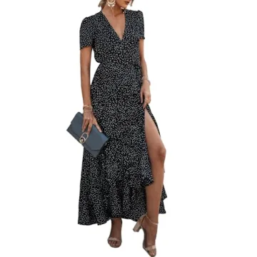 Show more Discover the enchanting Floral Maxi Dress, an exquisite creation designed to elevate your wardrobe and your confidence! Crafted from a blend of polyester and spandex, this dress promises a soft, comfy, and lightweight feel, making it an ideal choice for summer outings. Its unique features include a sexy wrap V-neck and high waist, providing a flattering silhouette for various body types. The allover floral and polka dot prints bring a burst of color to your look, perfect for any occasion.