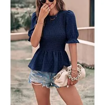 Show more Introducing the PRETTYGARDEN Women's Tops Summer Short Puff Sleeve Crewneck Swiss Dot Blouses - a perfect blend of comfort and style that is designed to elevate your summer wardrobe! Crafted from premium quality polyester blended with stretchy elastane, these lightweight smocked peplum tops provide not only a chic appearance but also an incredible level of comfort against your skin. With a delightful Swiss dot pattern adorning the fabric, these blouses are not just articles of clothing but a canvas for expressing your personal style. Available in vibrant colors including stunning Dot Navy, these tops are tailored to fit sizes from S to XXL, ensuring a flattering look for all body shapes.