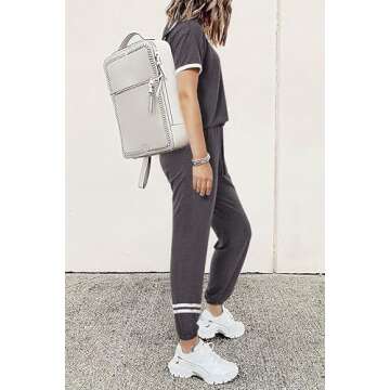 PRETTYGARDEN Women's Two Piece Outfit Short Sleeve Pullover with Drawstring Long Pants Tracksuit Jogger Set (Stripes Grey,Small)