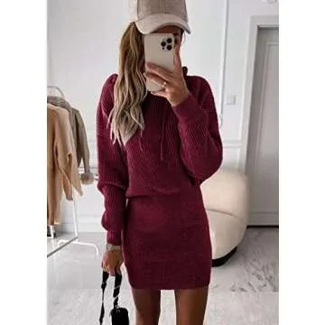 PRETTYGARDEN Women's Winter Rib Knit Pullover Sweater 2024 Fashion Fall Dresses Long Sleeve Hooded Bodycon Dress (Wine Red,Medium)