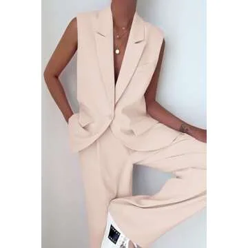 PRETTYGARDEN Womens 2 Piece Blazer Suits V Neck Sleeveless Vest Wide Leg Pants Sets Summer Matching Outfits (Beige,Small)
