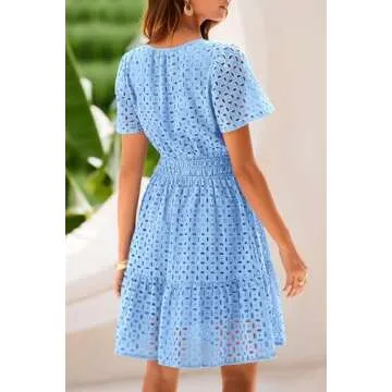 Show more Introducing the PRETTYGARDEN Women's 2025 Summer Short Dress—a perfect blend of elegance and casual charm. This stunning light blue dress features a shallow V-neckline and stylish short sleeves, making it an ideal choice for sunny days and warm evenings. Crafted from premium cotton, the fabric provides exceptional comfort and breathability, ensuring you stay cool and stylish no matter the occasion. The unique hollow-out lace details bring a touch of femininity to your wardrobe, while the body part is thoughtfully lined to avoid any see-through mishaps. Enjoy the playful ruffle hem that flares gently as you move, showcasing your legs beautifully.