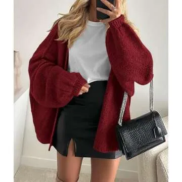 PRETTYGARDEN Womens Oversized Cardigan Sweaters 2025 Fall Long Lantern Sleeve Knit Open Front Lightweight Sweater (Wine Red,Small)