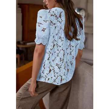 PRETTYGARDEN Womens Summer Lace Tops Short Puff Sleeve Casual Dressy Blouses Eyelet Crew Neck Button Down Shirts (Light Blue,X-Large)