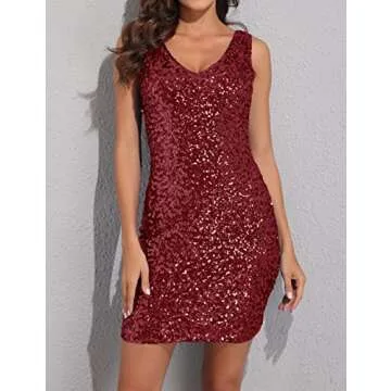 PrettyGuide Women Sexy Deep V Neck Sequin Glitter Bodycon Stretchy Mini Party Dress L Shiny Burgundy